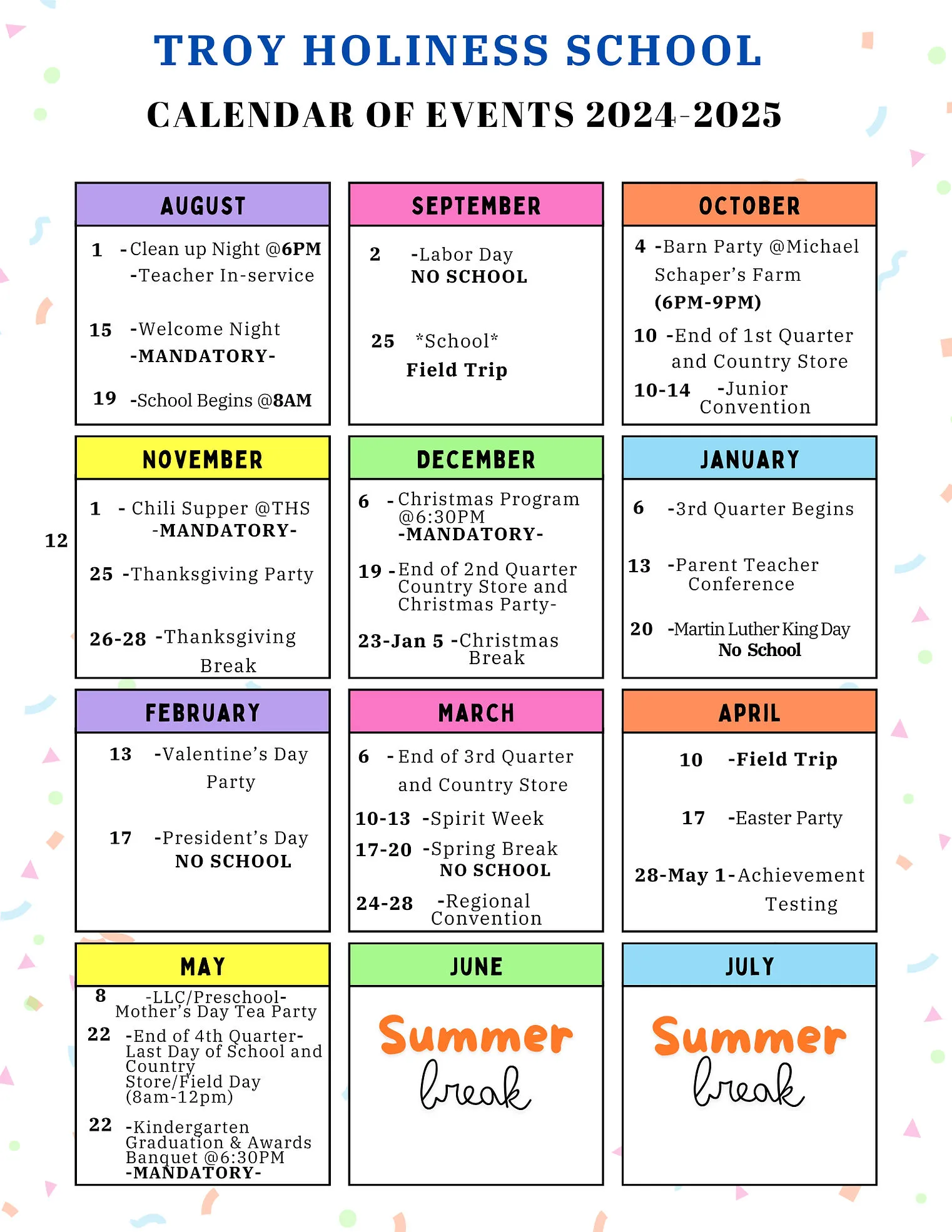Troy Holiness School follows a structured daily schedule designed to support academic success, spiritual development, and a balanced learning environment. Our schedule provides dedicated time for classroom instruction, Christian education, and student support.